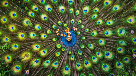 A breathtaking aerial view of a vibrant peacock displaying its colorful plumage in a lush garden, showcasing nature's beauty and elegance.