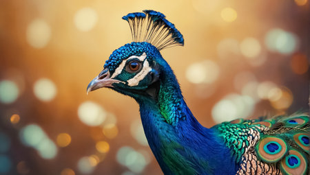 A magnificent peacock is showcased with its vibrant, fanned feathers. The bird's blue and green plumage contrasts with the soft, blurred backdrop. The composition is centered, highlighting the peacock's grandeur. This image is suitable for various commercial uses, including advertising and editorial content.