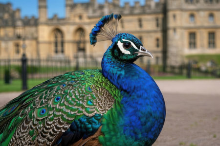 Peacock in front of Windsor Castle, England, UK.