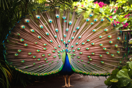A colorful peacock stands proudly in a tropical garden, expanding its magnificent feathers to show off vibrant patterns. The lush surroundings enhance the beauty of this stunning display.