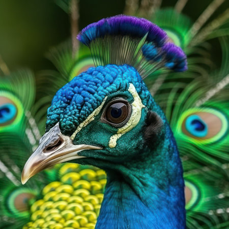 A stunning portrait of a peacock showcasing its vibrant feathers against a softly blurred green background, embodying the beauty of wildlife.