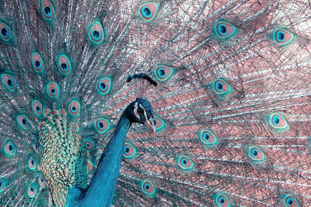 Beautiful peacock, Pavo cristatus, with feathers out