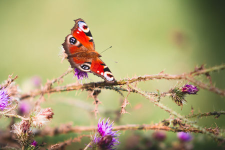 butterfly pollinating a flower. wildlife. colorful detailed macro photo of an insect. close-up. space for text. screensaver. bokeh. butterfly. Aglais io. Nymphalidae.