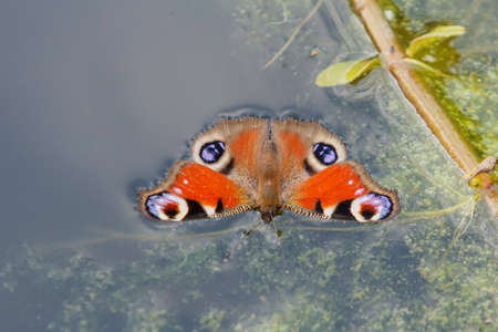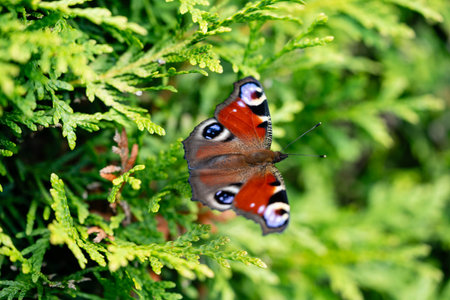 Portrait, a close up of a peacock butterfly on a plant, in nature.