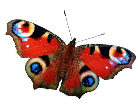 Aglais io or European Peacock Butterfly or Peacock. Butterfly on flower. A brightly lit red-brown orange butterfly with blue lilac spots on its spread wings sits on purple yellow flowers.