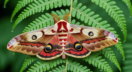 A vibrant Atlas moth butterfly the largest moth species in the world, showcases its elaborate wing patterns, with distinctive eye-like markings and orange-brown hues, as it rests peacefully among the foliage of a garden.