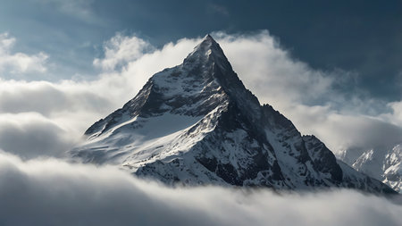 Misty mountain peak surrounded by clouds, serene atmosphere. Nature and tranquility concept