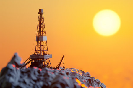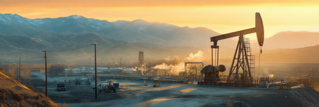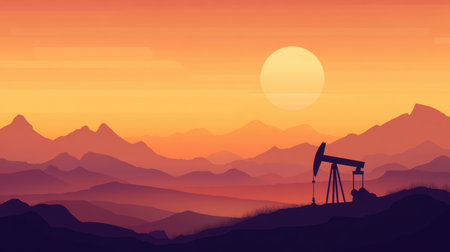 A striking silhouette of an oil pump jack against a stunning sunset, highlighting the intersection of nature and industry, with majestic mountains in the background.