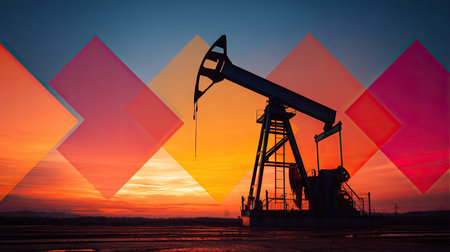 Captivating image of an oil pump jack against a stunning sunset, showcasing the intersection of industry and nature with vibrant geometric designs.