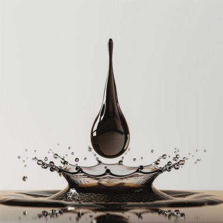 A striking image capturing the elegant moment of a black liquid drop creating a splash, showcasing the intricate dynamics and beauty of fluid motion against a clean, minimal backdrop.