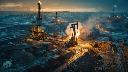 Industrial Oil Drilling Site in the Early Morning Light Showcasing Extraction Activities and Machinery in a Remote Location. Generative AI