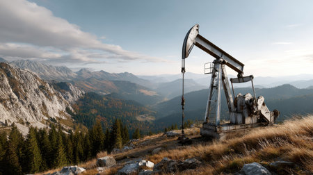 A vintage oil pump jack stands on a hillside, surrounded by a stunning landscape of mountains and forests, showcasing the intersection of industry and nature.