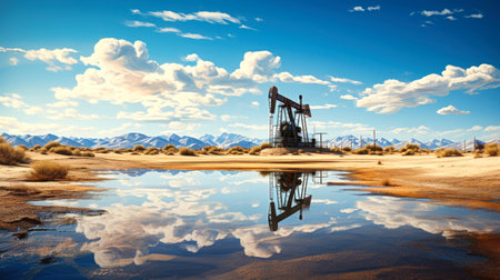 An oil pump jack operates in a dry desert landscape, showcasing industrial energy extraction amidst natural elements and a bright blue sky.
