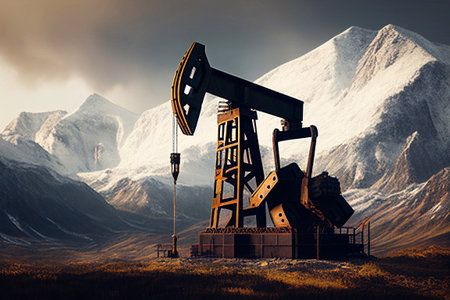 Working oil pumps in mountains. Natural resources industry. Oil rig. Generative AI.