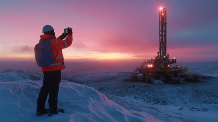 Engineer inspecting a snow-covered drill rig at a mining facility, with the horizon softly glowing under winter light