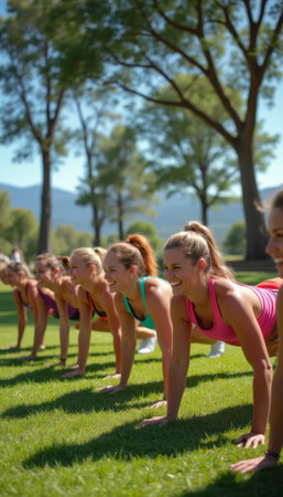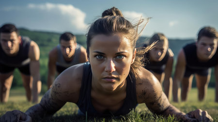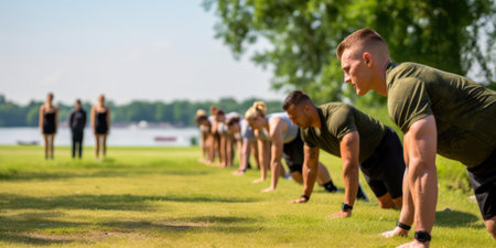 A group of participants engaged in synchronized outdoor fitness training, performing planks and squats on grass. A trainer leads the session, emphasizing unity and effort in the workout.