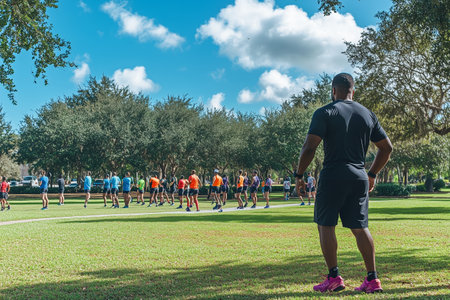 A coach giving a motivational speech to a youth soccer team before a match on a sunny day. Concept Motivational Speech, Youth Soccer Team, Sunny Day, Coaching, Sports Mentoring