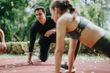 Diverse group of young athletes smiling while doing planks during an outdoor training session