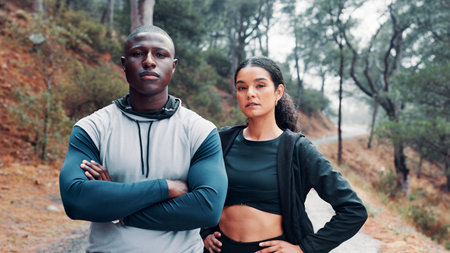 Fitness, portrait and serious with interracial couple outdoor together for cardio training, running or workout. Arms crossed, confident and exercise with people in forest for health or wellness