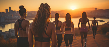 Friends are engaged in a fitness session outdoors, enjoying the warm sunlight while sharing smiles and laughter, creating a vibrant atmosphere of camaraderie.