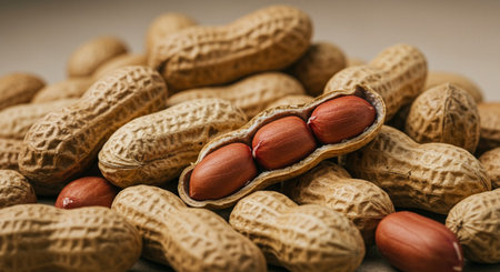 Raw peanuts arranged in a uniform pattern on a soft beige background, showcasing their textured shells and natural colors. Perfect for food and snack concepts.