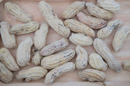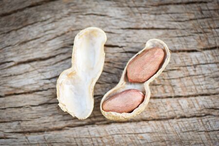 Roasted peanuts on a wooden background / Shell peanut in shells for food or snack