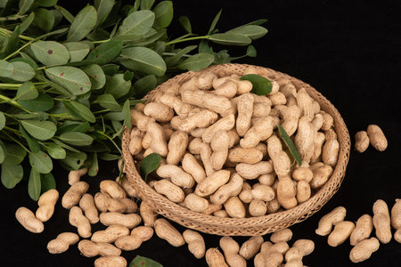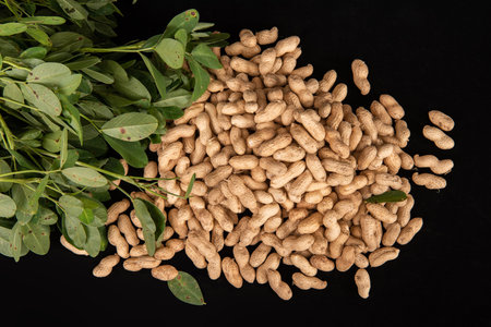 Pile of unpeeled peanuts in shell close-up on black background, place for text.