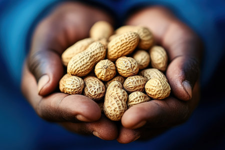 Hands holding a generous portion of unshelled peanuts, showcasing natural texture, earthy tones, and the essence of simplicity.