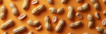 A close-up of unshelled peanuts on a vibrant orange background, arranged in a visually appealing pattern.