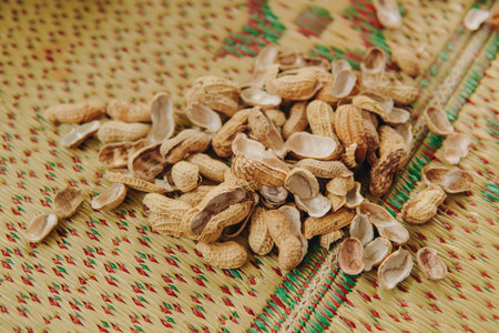 Pile of traditional Indonesian snack peanuts, its shell scattered on a traditional floor mat.
