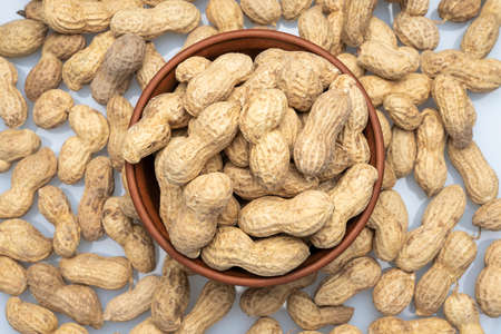 Dry peanuts in a wooden bowl on a white background. Top view. Copy, empty space for text.