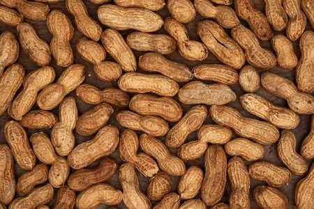Unpeeled peanuts on a wooden background, top view, selective focus, shallow depth of field. Some copy space for your text. Studio shot. Organic nutritious ingredient. Gourmet appetizer. Tasty roast snack. Healthy food concept