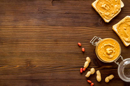 Peanut butter or paste in an open jar and peanuts in the peel scattered on a dark background, banner, menu, recipe place for text, top view.