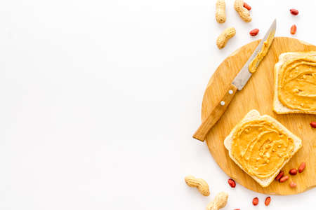 Flat lay composition with peanut butter sandwich, glass jar, peanut and spoon on white background, space for text