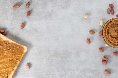 toast with peanut butter and peanuts on a gray background. copy space, top view.na gray background. copy space, top view.