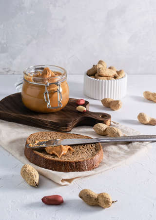 Bread with peanut paste on a light napkin. A glass jar with paste on a dark brown plaque in the background. Peanuts in a white bowl on a light table. Nuts are scattered on the table