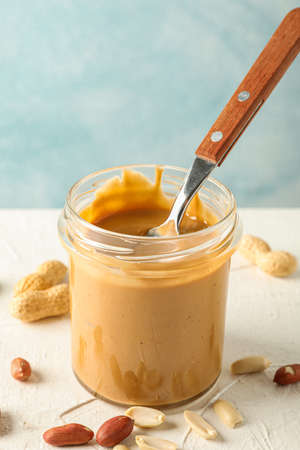 Glass jar with creamy peanut butter and spoon, and peanut on white table against light background, space for text