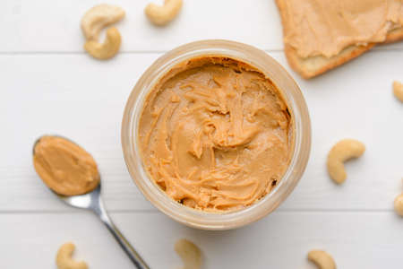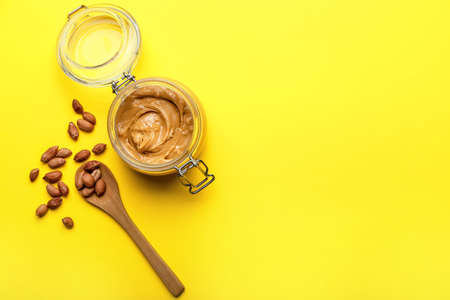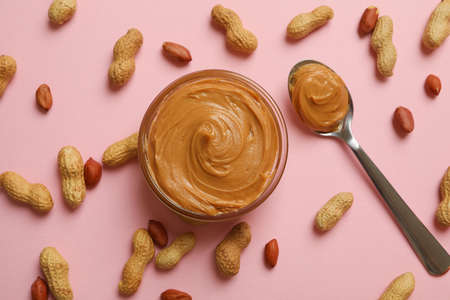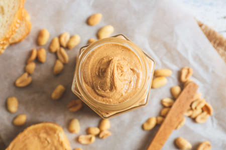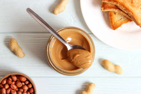 Peanut butter in a glass jar and spoon on a beige background with toast, scattered nuts and napkin. Concept for a delicious and healthy snack for sweet breakfast sandwiches. Top view, copy space.