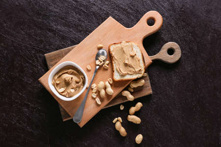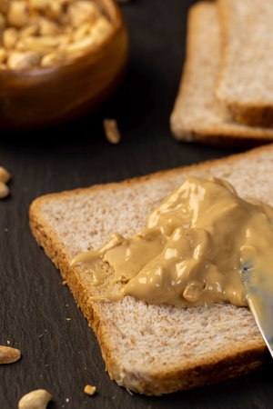 bread and soft peanut butter, peanut butter on a piece of bread and roasted peanuts on the table, close up on black slate
