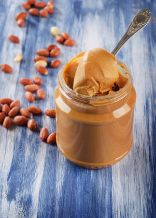 peanut butter in an open jar on a blue wooden background, next to peanuts scattered