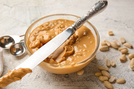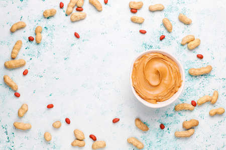 Peanut butter in bowl and peanuts on kitchen table. Top view.