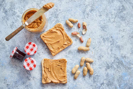 Two tasty peanut butter toasts placed on stone table. With small jars of fruit jam big peanut butter container. Knife on side. Above view with copy space
