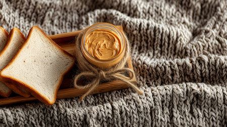 Rustic jar of creamy peanut butter with twine bow beside white bread slices on wooden tray. Set against a soft gray knitted background for a warm, homely feel.
