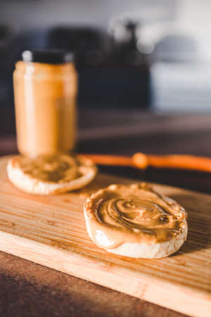 peanut butter on freshly toasted English muffins for breakfast with kitchen bokeh, healthy vegan food recipes