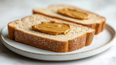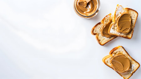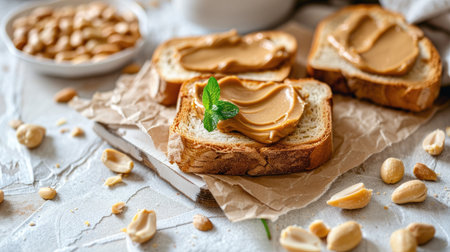 Vegetarian peanut butter toasts on a light table background, offering a cozy and appetizing breakfast visual