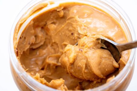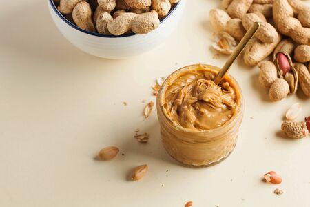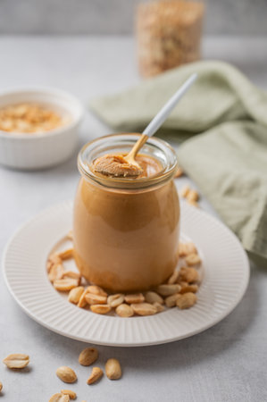 Creamy peanut butter in a jar on a light background with scattered roasted nuts, spoon and napkin close up. Concept for a healthy, nutritious vegetarian snack for an American breakfast. Front view.