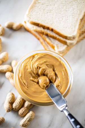 Spreading creamy peanut butter on toasted sliced bread for breakfast