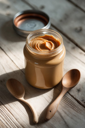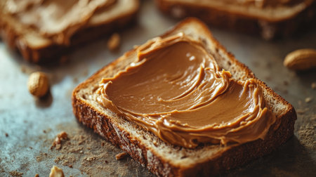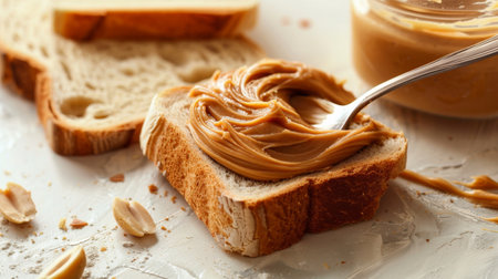 Chunky peanut butter spreading on a crispy piece of toast, with visible texture and rich flavor, perfect for food photography