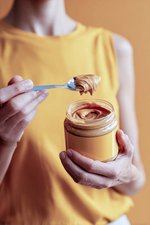 Woman's hand with a spoon taking peanut butter from a glass bottle on purple background. Vegan and bio snack. Vertical picture. Top view.