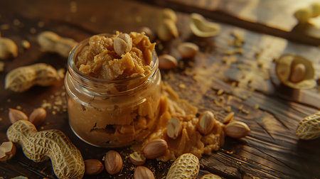 Closeup peanut butter in a glass jar, a handful of peanuts in shell. Foodphoto. Copy space. American culture. Breakfast, dessert for vegetarians.